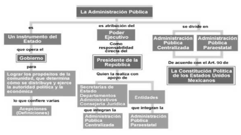 El Gobierno se sirve de la Administración Pública Federal para realizar las funciones asignadas al Poder Ejecutivo de la Federación. La Administración Pública Federal, en consecuencia, sirve de soporte para asumir las responsabilidades designadas al Presidente de la República, quien se apoya para ello directamente en las Secretarías y Dependencias del Estado. Al sistema de administración del Gobierno Federal se le denomina Administración Pública Federal, y opera a través de dependencias y entidades que dependen del poder ejecutivo.